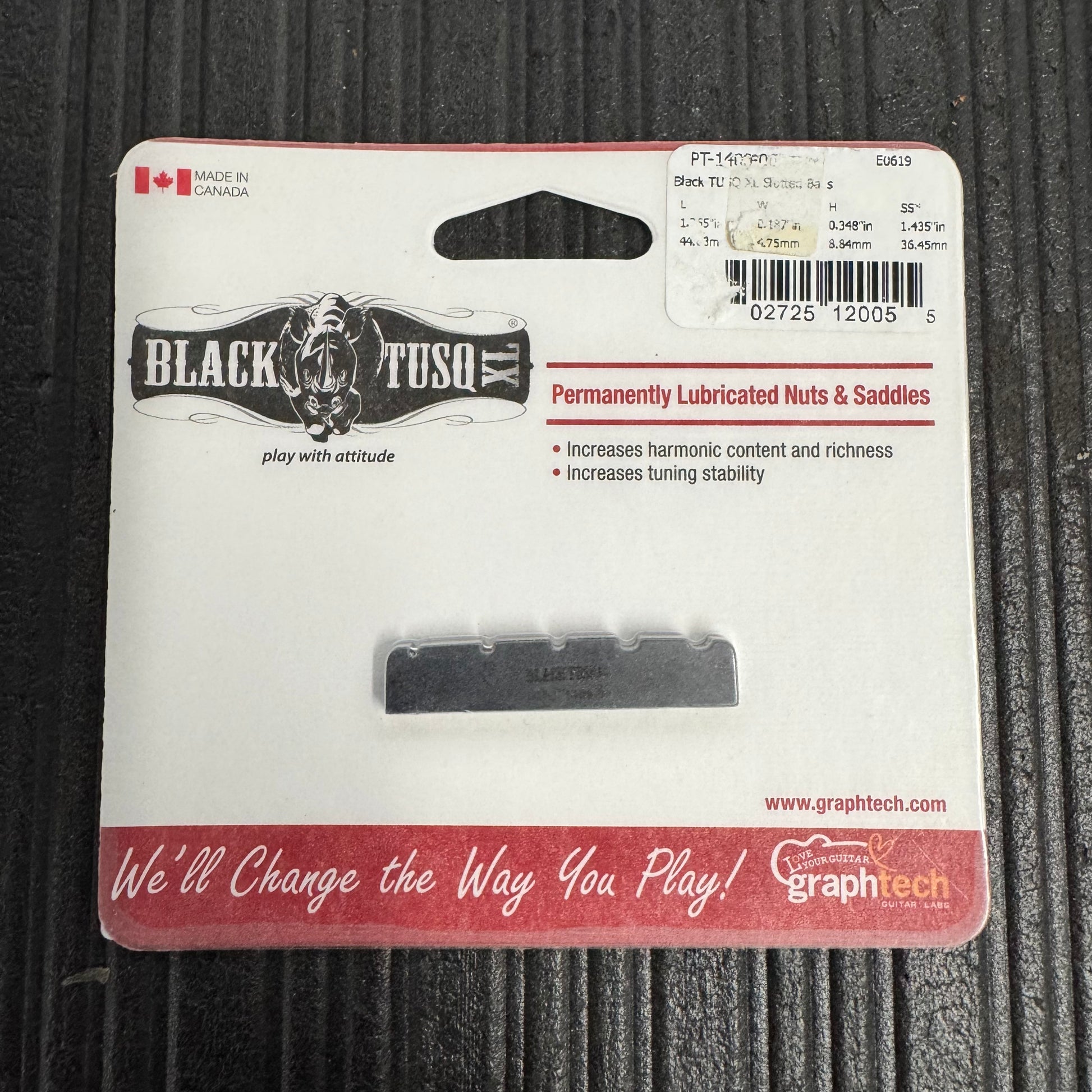 Black TUSQ XL is designed to boost guitar tone and performance. This precision engineered nut is made with a specially formulated material which couples the strings' vibrations to the neck and brings out the hidden harmonics and richness in every note. It is based on the highly resonant TUSQ man made ivory, but is impregnated with PTFE to improve the tuning performance of the guitar.